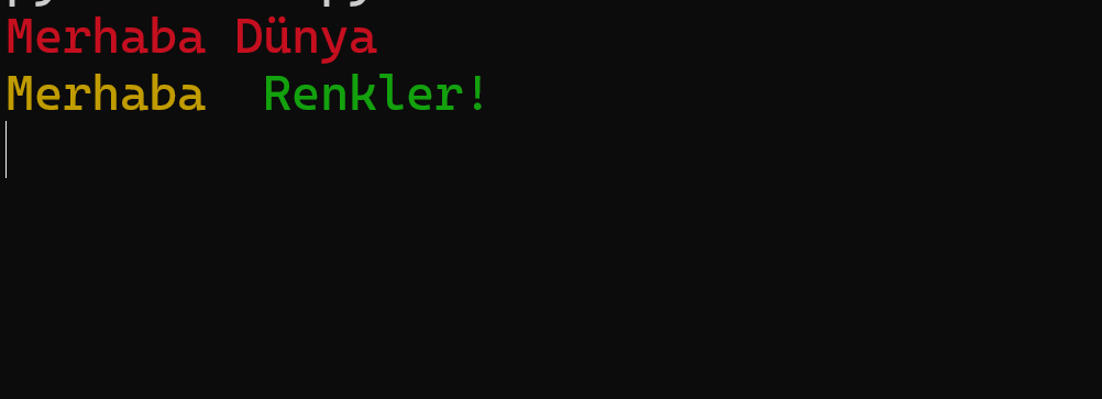 print(f"{Fore.YELLOW}Merhaba {Fore.GREEN} Renkler! {Style.RESET_ALL}")